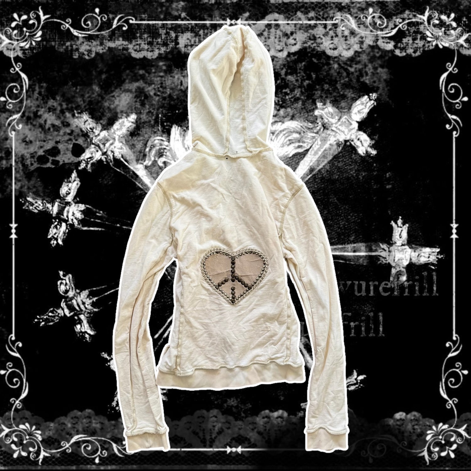 crème rhinestone heart peace sign y2k distressed hoodie